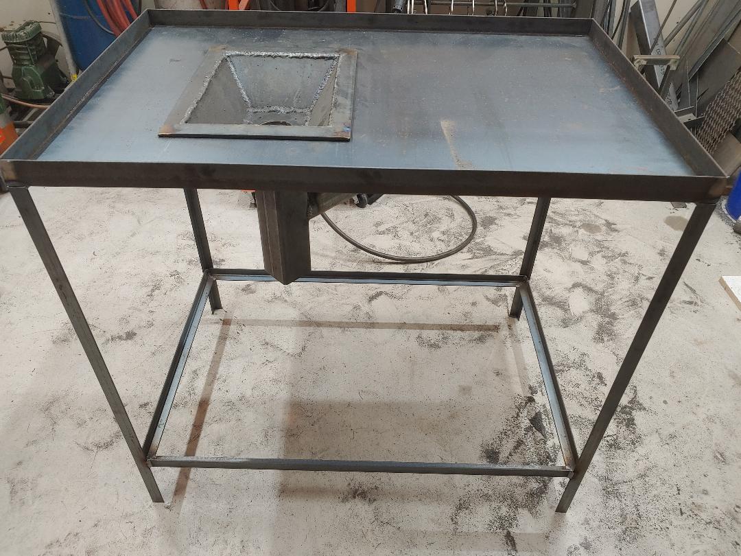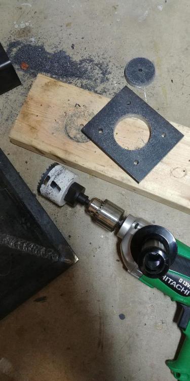 I've made some progress on my forge in the past couple of months, here's some pictures of the updated progress. I was able to drill a 2-1/2" Diameter hole in the bottom of my firepot as well as the piece of plate of my tuyere that will bolt to the bottom of the firepot. I also drilled and tapped 4 holes in the bottom of my firepot for the tuyere to be bolted up from the bottom. There's also a picture of my tuyere welded up, you will see there's a slot I ground in the tuyere mounting plate. I'm going to run a piece of 1/4" round through there for my clinker breaker handle. My clinker breaker will be one of the hole slugs that I drilled out and ground down for approximately 1/4" gap around the outside of the clinker breaker to the edge of the hole in the bottom of my firepot. I need to make brackets and fab the ash dump at the bottom of the tuyere next time I work on it.