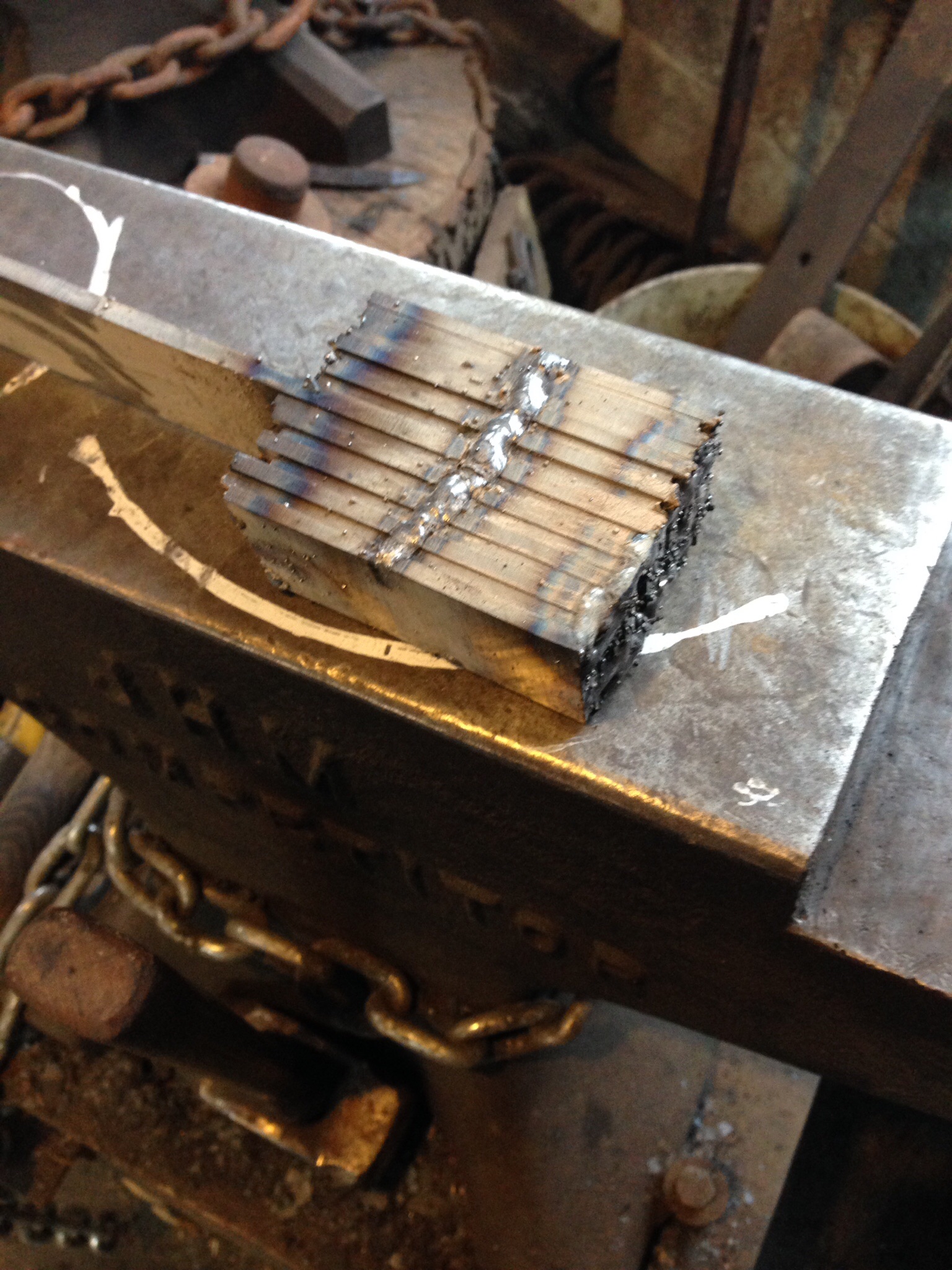 Charles R. Stevens Posted May 25, 2015 Posted May 25, 2015 (edited) You would make a billet up the size of a deck of cards or a bit larger and then draw it out to lenght. So instead of welding up 30" peices of 1/8" stock untile you reach 1 1/2" in with (luck with that) you weld up a 1 1/2x 1 1/2x 6" bilet , this may start out as a core of 6 peices of 1/2" square (money bars were about 3/8") with two peices of 1 1/2x 1/4" O1 welded down each side to make the edges (dont loose track of them) then the bilet is drawn out to lenghth. As it typicaly takes 3 pases at welding heat to get a weld good and stuck trying to go the other way will lead to flustration. So a 1" burner in a 12" high by 9" deap forge will do you (9" is the size of one soft fire brick, and acording to an artical I read by Mark Asbery (spelling?) he tested burners and forge diamiters and found 1" burners were slightly more effecent and that a 12" pipe had enugh space to alow the fuel to burn before hiting an obstruction) as most folks cant work more than 6" in a heat (larger stock, sledges or powerhamers not withstanding) a forge that heats 9" is plenty. To heat treat the blade needs a long oven, but as welding heat isnt what your after their an oven that will reach critical and hold it stedy for an hour is the animal you need. So two "forges" a working forge, and a heat treat oven.or you can go traditinal, 4" cube of iron (we will let you use A36 as a substitute) and 1 and 1 1/2# hand hammers, a 4 and 6 # sledge for your thrawls and a charcoal forge (gets plenty hot and heats just about 6") you'll need a trench forge for heat treat, but thats another deal...so got 3 budies you can rope in to helping? The third pumps the bellows...now one of the characters here that acualy make patern welded swords may come along and tell me I'm blowing smoke, but I doubt I'm off the mark enugh to embarase myself. Edited May 25, 2015 by Charles R. Stevens Quote