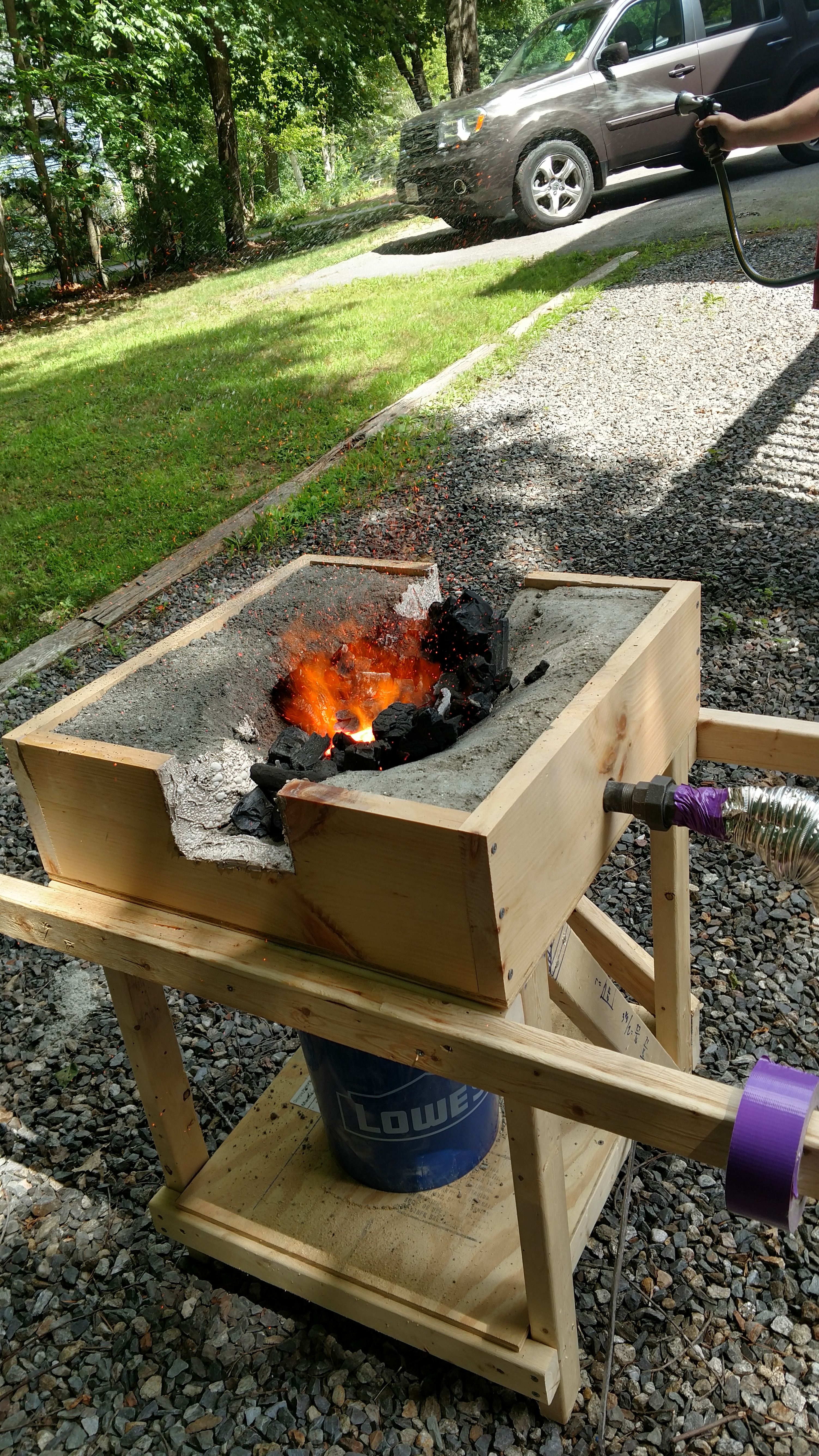 Cappygold Posted July 8, 2017 Posted July 8, 2017 (edited) So I basically designed this off of a JABOD forge but used a high heat fireclay as the base foot the mix. It ended up being mostly a mix of 2:1:1 fireclay to sand to perlite. I used Portland cement and more sand for the layer past the 'fire pot' because I needed more volume. Also reinforced the edges or crumbling bits with store bought Hercules heavy body sodium silicate which works like a charm for those curious. I used lump charcoal and it got decently hot but threw Sparks like a xxxx. Currently working on an insulating and spark trapping dome. Link to pics on drive because chrome doesn't like me today: https://drive.google.com/folderview?id=0B69b0Z0wuf7xSkZfMGNWSENYZ3M Edited July 8, 2017 by Mod34 Edited for inappropriate language Quote