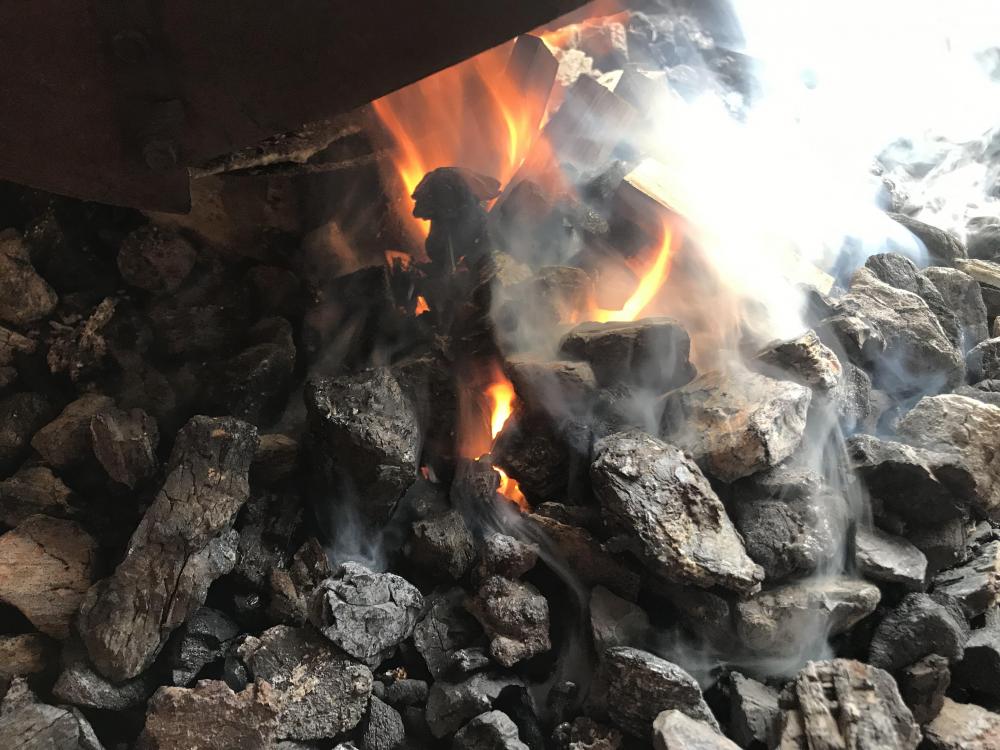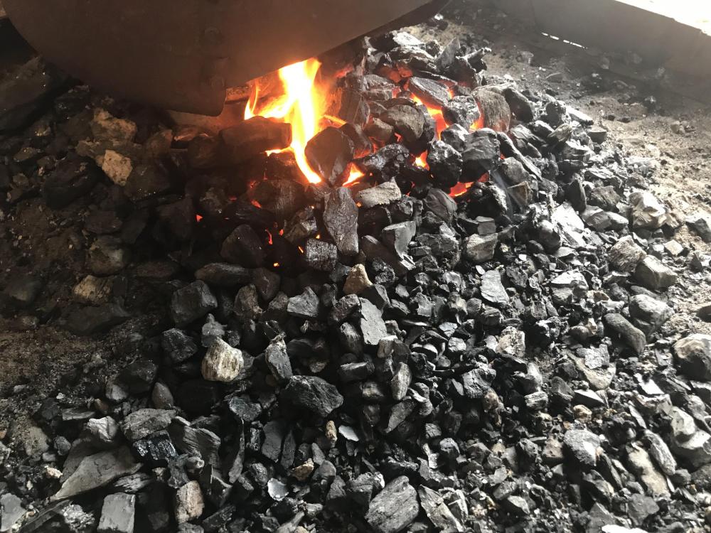 JHCC Posted November 25, 2018 Posted November 25, 2018 In many places, soft/bituminous coal is hard to come by, but anthracite/hard coal is more readily available. In the USA, many Tractor Supply Company (TSC) stores will carry anthracite, usually in "nut coal" or "rice coal" sizes. This can be used for forging, but it presents some challenges. This has been discussed elsewhere on IFI; this post is an attempt to put the bulk of that information in one place. CAVEAT As noted below, bituminous coal, coke, and charcoal are all superior to anthracite as forge fuels. That's not a point that needs to be argued. However, this post is not intended as advocacy for anthracite as a superior or even preferable fuel, but as a practical guide to its use for those who -- for whatever reason -- have no access to regular smithing coal or coke. ABOUT ANTHRACITE: Among the various types of coal, anthracite has the highest carbon content, the greatest hardness, and the highest energy density and is lowest in ash and volatile compounds. "Nut" and "rice" are measurements of size, not content: nut coal will fit through a 1-5/8" x 13/16" mesh, while rice coal will fit through at 5/16" x 3/16" mesh. Because anthracite does not have the bitumen/asphalt content of soft coal, it does not coke. This means that anthracite will not form a "cave" of coke as bituminous will. Instead, as it burns, each lump will become smaller and smaller until its carbon content is completely burned away, leaving behind roughly 8-13% of its dry weight as ash. In practice, therefore, nut coal will pass through pea-size on its way to becoming rice coal, and rice coal will become barley and buckwheat on its way to its final destination as ash. Rice coal, in my experience, has a tendency to spit and pop as it heats up, and I've had glowing shards projected out of the fire at high speed. (One left a scar under my right eye, and another -- when I was turned towards the anvil and my back was towards the fire -- flew down the cleft where my back changes name. Wear eye protection and a shirt.) The absence of volatile compounds and its high density also make anthracite much harder to light than soft coal, coke, or charcoal. With bituminous coal, a fairly small amount of heat will vaporize those compounds and cause them to ignite; this in turn provides sufficient heat to vaporize and ignite the solid carbon. Without those compounds, that heat has to come from somewhere else. Additionally, because there is no burning of volatiles to create and sustain a draft of moving air and because the higher density of anthracite reduces the air/fuel ratio (especially compared to coke and charcoal), constant blower use is mandatory to keep an anthracite fire going. (The trade-off here is that anthracite burns much cleaner than bituminous, with a short blue flame and very little smoke.) One thing to look out for is that anthracite often has pieces of shale or other nonflammable rock mixed it. I've even found chunks of wood. Just pay attention to what's going in the fire, and it shouldn't be a problem. Also, most bagged anthracite gets watered down before bagging, to help control dust. Rice coal seems to have more water per bag than nut, but that's not a problem if you add it around the outside of the fire to dry off before it burns. LIGHTING: In order to start an anthracite fire, then, you'll need a lot of heat. This can be accomplished in a couple of different ways, but I personally have had the greatest success by using a LOT of kindling. Start with a ball of newspaper and some fine softwood slivers, then add some fine hardwood kindling (about 1/4" square) and then progressively thicker, up to about 1/2"-3/4". (NOTE: make sure your kindling is hardwood. Softwood doesn't put out enough heat to get anthracite going. I cut up pallet wood on the tablesaw to about 3-4" long and then split it on the hot-cut.) Adding a candle stub to the pile also helps get things going nicely, and you can also put a few pieces of lump charcoal on top to help get things going. Light the newspaper, and gradually increase the blast. Once the kindling fire is well-established, pile coal around its perimeter. Gradually add more coal around the outside, forming a sort of "anthracite volcano" with the kindling fire as its core. When the kindling fire is going strong, you can start to sprinkle small pieces of coal on top, but make sure to leave the top open to allow heat and burning gasses to escape. Gradually increase the blast and keep adding coal until your fire is going well. FIRE MAINTENANCE: As noted above, anthracite does not coke, but simply becomes smaller and smaller until it burns away. Therefore, fire management is slightly different from other coals, and is actually somewhat more like how one maintains a charcoal fire. Because anthracite doesn't coke, an anthracite fire doesn't hold its shape as well as a bituminous fire. Expect things to move around a lot, and be prepared to make liberal use of your rake to reshape the fire every time you put your workpiece back in the fire. You can add coal directly on top of the fire, and you won't get the clouds of smoke that would result from doing that with green soft coal. Make sure you have a constant supply of air, or your fire will go out. An electric blower on some variety of speed control is best, but a constant-speed blower with a gate or air dump will work. Deadman switches are a gamble, as the fire tends to go out if you have to step away from the forge for any length of time. Hand-cranked blowers and bellows only work well if you have an apprentice with nothing to do but pump the fire. You'll probably find yourself reaching for the watering can a lot less with anthracite than with bituminous; at most, an occasional sprinkle around the outside to keep the fire from getting too big. However, since there's no need to wet down the coal as it cokes (as you would with soft coal), you're probably better off managing the fire size by re