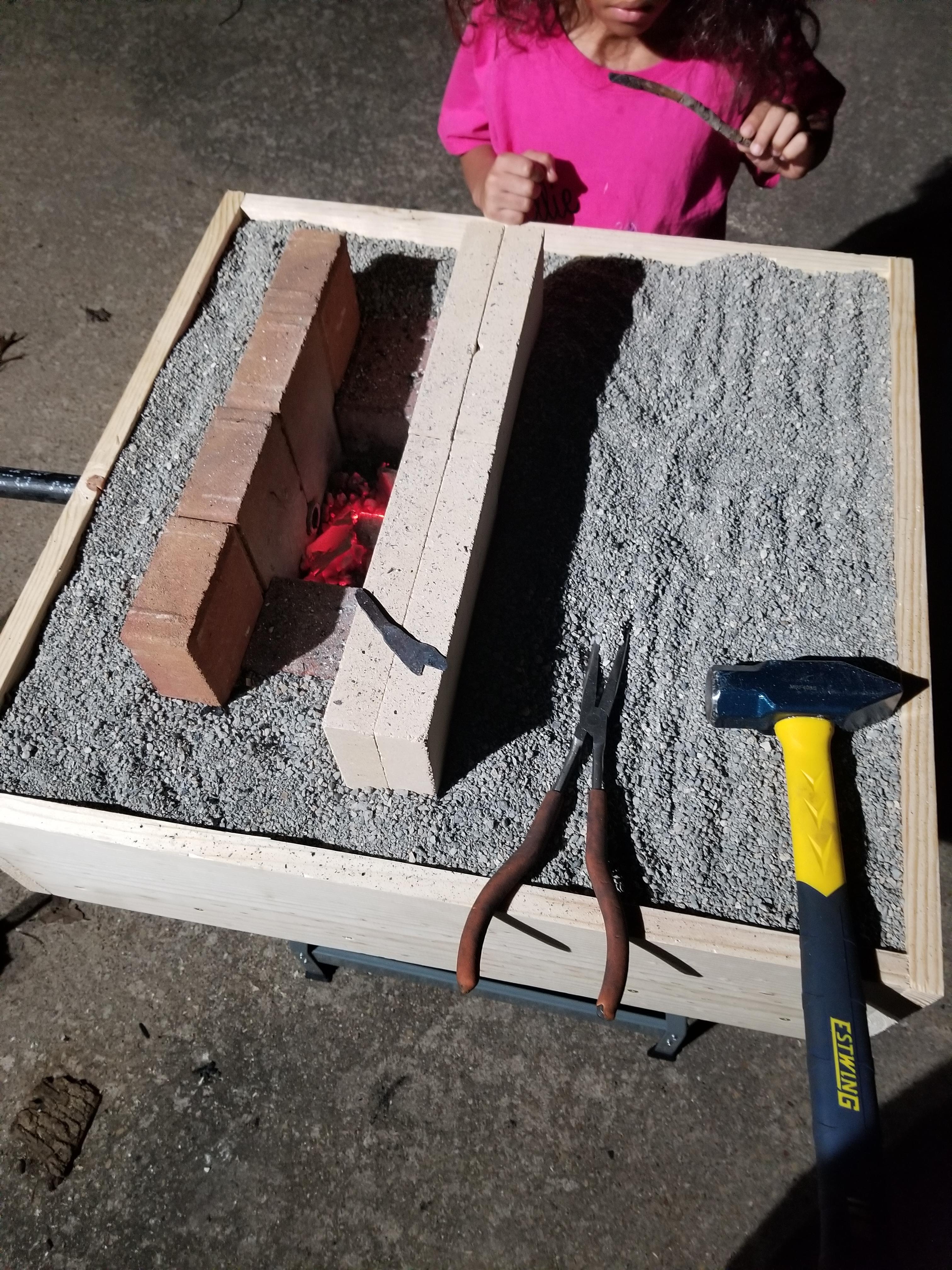 CtG Posted January 6, 2020 Author Posted January 6, 2020 I did get to play for a couple hours today! Built the fire up a bit above the side bricks, I need to go even higher I think. Getting fuel chunk size closer I think, it is definitely small to massive in the bag. I hot-cut the "fuller" off using a Harbor Freight cold-chisel (I doused it every 3rd blow or so to keep it from losing whatever excuse for temper HF gave it- it never dulled though!) Then I formed a bit of a chisel profile in the rebar and cut it off. I then heated and quenched both, still need to temper them. They skate a Nichols Chainsaw File as is! So, work goodies aside... One of my tuyere siding bricks has already cracked- they were both glowing while I was getting after it. A fire-brick facing is probably in order. As for the floor, it held up very well, but I do have some mild charring of the plywood. It seems to be around the gap between the bricks, so I will likely play around with either a double layer of firebrick, staggered, or maybe a dovetail of the redbrick, though I think it will be more crack prone at that point. I would like to avoid tweaking the tuyere height too much if I can avoid it, as my box is already cut for it. Though in all reality, I can always make a new side-board. Or even fishtail in an adjusted piece. I purchased 2 small Behrens metal "trashcans" to put the litter and some bricks in- worked a treat, fit all but 2 redbricks and the firebricks. That way, I have a nice convenient breakdown size without having to worry about my cats using the litter for its intended purpose. I'm pretty happy so far! IF&C, I was considering that method amongst my options- the sawing motion mounting has its appeal, to be certain. Did I mention I already had a couple neighbor kids come watch? Already drawing a crowd and I barely know what I'm doing! Quote