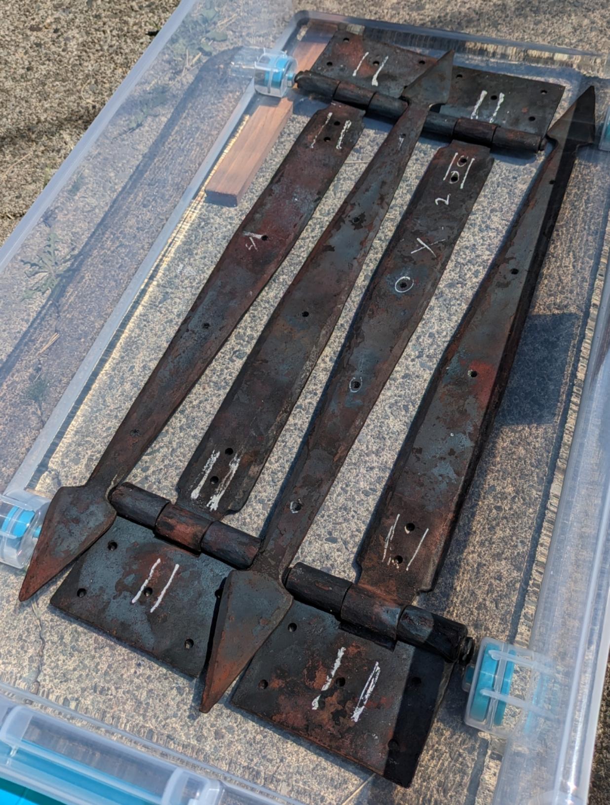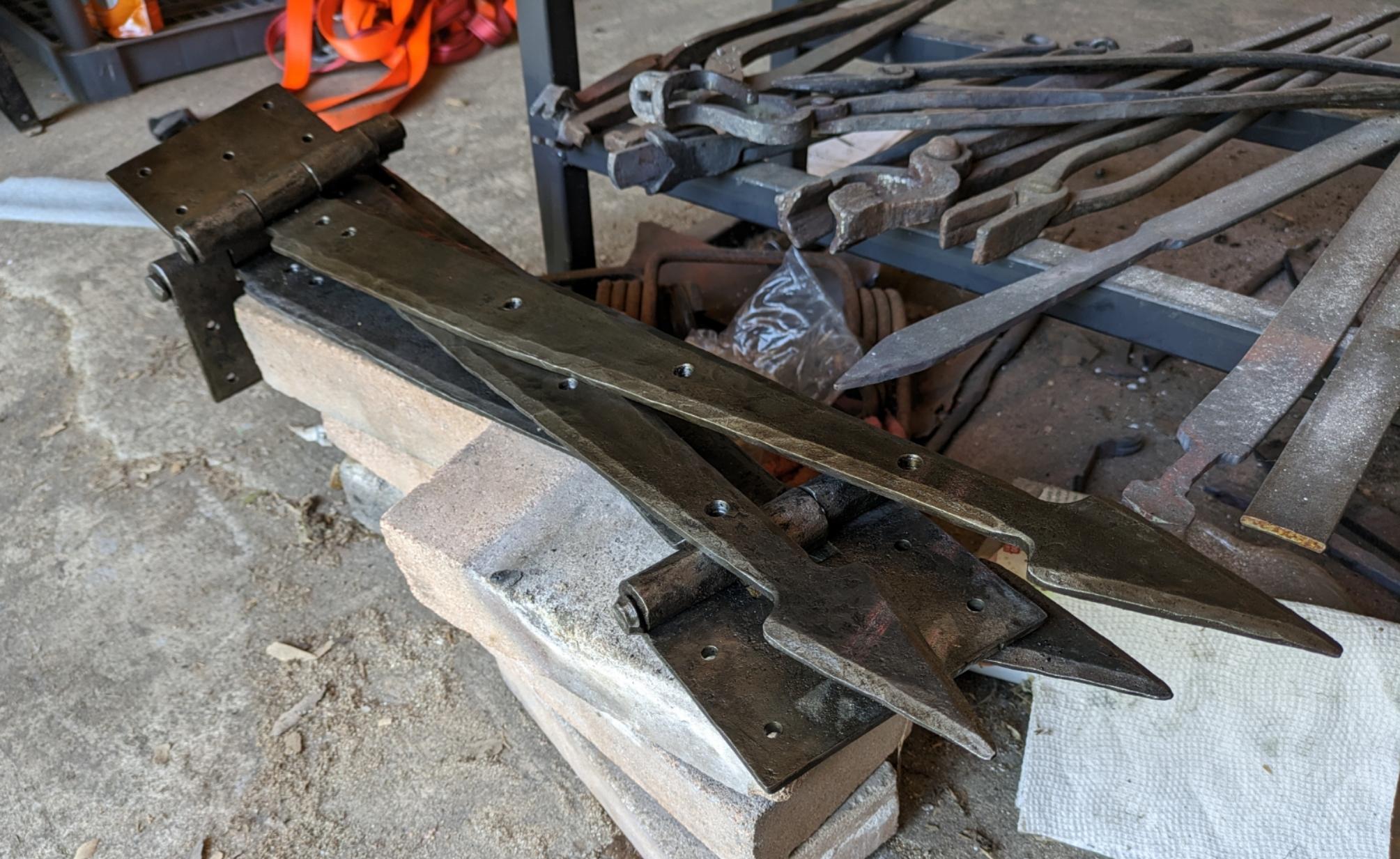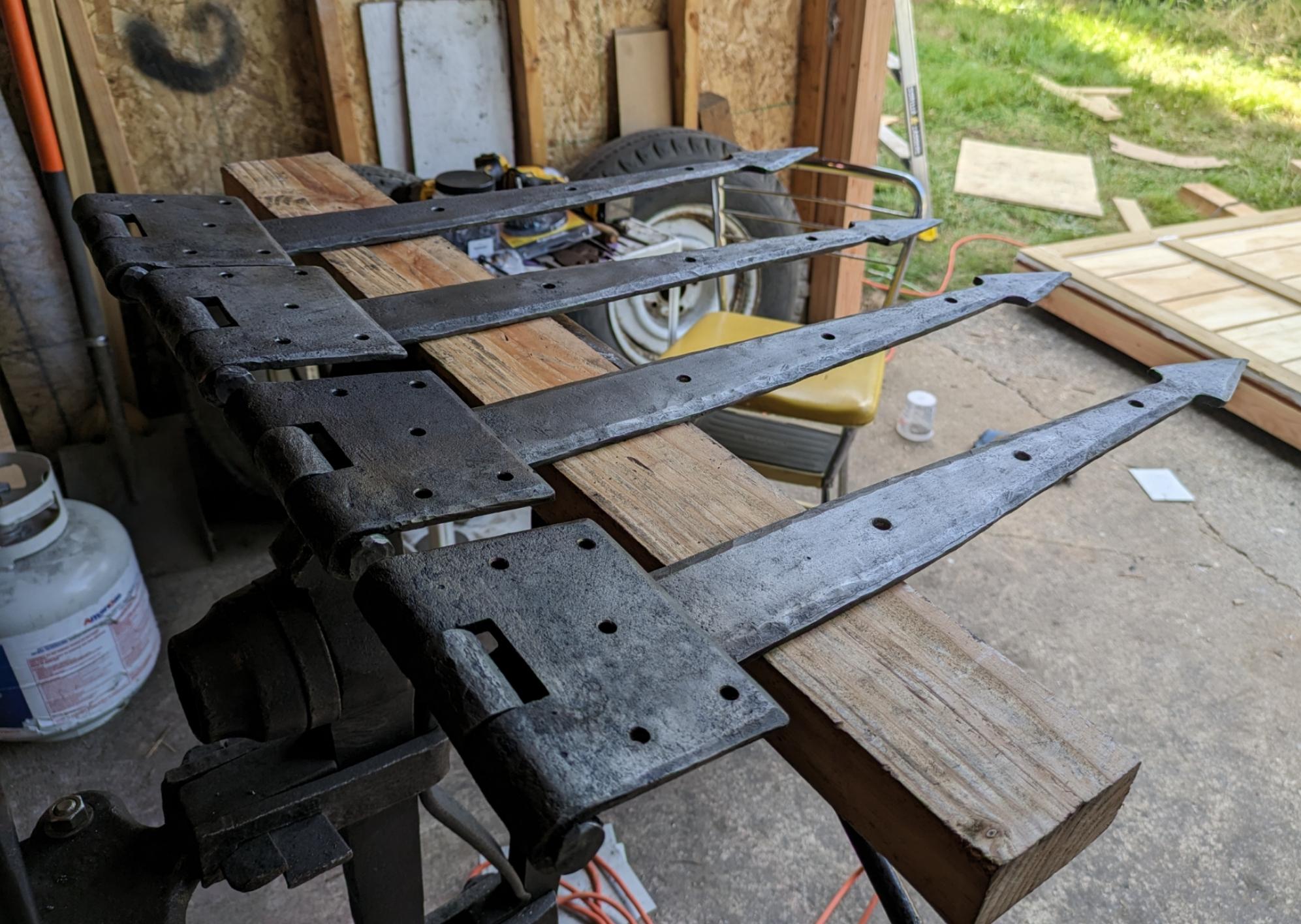 M.G. Posted June 29, 2023 Posted June 29, 2023 Hey guys, sorry I've been out of the loop again broke my phone a few weeks back and finally got a new one. Unfortunately, that means I have lost all of my photos from the last few years, as well as a bunch of progress shots of a bunch of my projects, this one included. So you will just have to use your imagination a little. Well... Just to catch you up, I have slowly been working on building out my smithy. It started as an attached carport adjoining my detached garage. Over the last year or so I have been working on different aspects of the shop build in-between other home renovations. Started out by framing in and enclosing 2 of the open walls. Leaving the front wide open. I then built out my new (and first) gass forge. And a new anvil stand. Once I had those I couldn't help but move a few tools into the space and start working. After a handful of projects made in a half a** and half built half of a space, I decided it was time to make it a full a** space. But before I could move the rest of my tools into the smithy and out of the domestic garage, I needed to make the space secure. It needed a set of barn doors. And a set of hand forged strap hinges to hold em up. So I set out on making a big old set of hinges. The doors are about 4 and a quarter feet wide and 8 feet tall, weighing just about 180lbs. each if not more. So I needed the hinges to be sturdy. I decided to make them out of 1/4 inch plate of mild steel for the straps and the jam plates. I started out by cutting the stock plate down to size for the jam plates, and straps. I then forged bevels up n the jam plates and rolled the hinges barrels and drifted them to size. Next I fullered down the material for the spade finial using a spring fuller I made a little while back. Then chased that taper back to about the midway point of the strap. Followed by bevels to knock off the corners. Then to rolling and drifting the barrel, followed by straightening and tinkering for a while. I cut the hinges barrels with an angle grinder and and some hand files to clean them up. Next I made my hinge pins and started with an upset on one end to become rivet head. Once all the pins were cleaned up and cut to length I fitted them to straps and plates, and riveted over the ends of the pins. And tried to true everything up at the anvil. Then I got all the holes drilled and counter sunk. Now that I had the hinges put together, I dropped them all in a vat of white vinegar for about 24 hours,to eat all the forge scale off. Pulled em out and scrubbed em down with baking soda water. And hit em with a wire wheel to finish cleaning them up. I then used a bit of heat and some "blacksmiths finish paste" mostly BLO, bees wax and terp. With a bunch of charcoal dust mixed in. Then I built the doors, I'll save you the carpentry stories. But I got the doors hung today and the hinges seem to swing freely with no issues. Other than I kind of stink at hanging doors, and there are some slight fitment issues that I will need to address before they will close securely. Next I will forge/fab a simple bolt lock and forge some handles. Quote