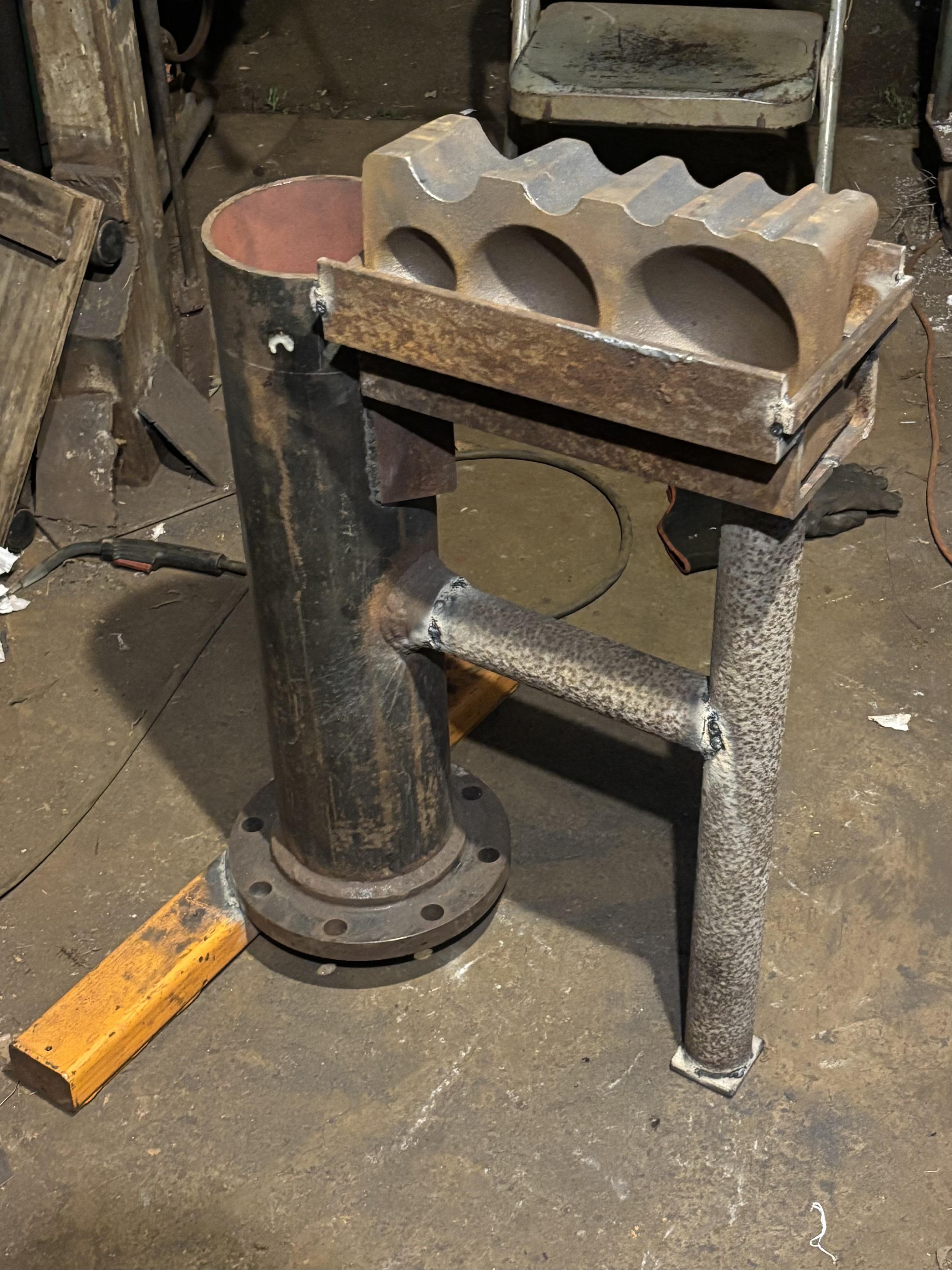 JHCC Posted October 5, 2025 Author Posted October 5, 2025 Update: I made a stand for the block. Regardless of whether a narrow or a wide face is upwards, the working surface is about the same height as my anvils (as are the jaws of the attached striking vise). The large pipe is filled with sand for additional mass and stability. Quote