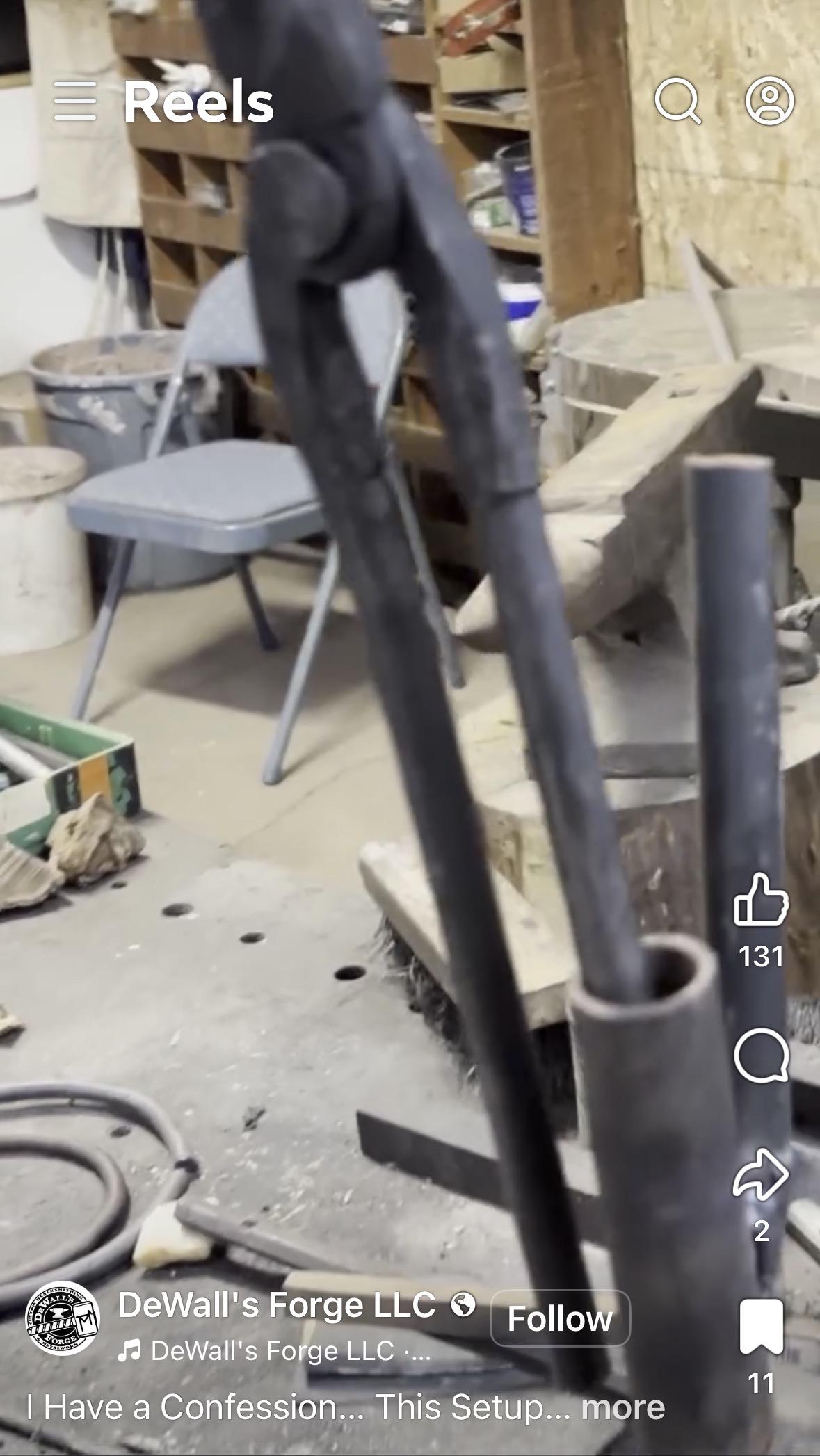JHCC Posted January 31 Posted January 31 We’ve all seen bending jigs with a piece of pipe and a smaller peg to one side, for bending hooks and the like. Here are some screenshots of a version I spotted in a Facebook video that takes a new approach. The angled piece on the side will accommodate both different thicknesses of stock, as well as giving plenty of choices for how far from the pipe one should engage the peg. The pipe also makes a good place to store the scrolling tongs between heats. And here’s the link to the original video: I Have A Confession…This Setup Was A Little Unbalanced. Quote